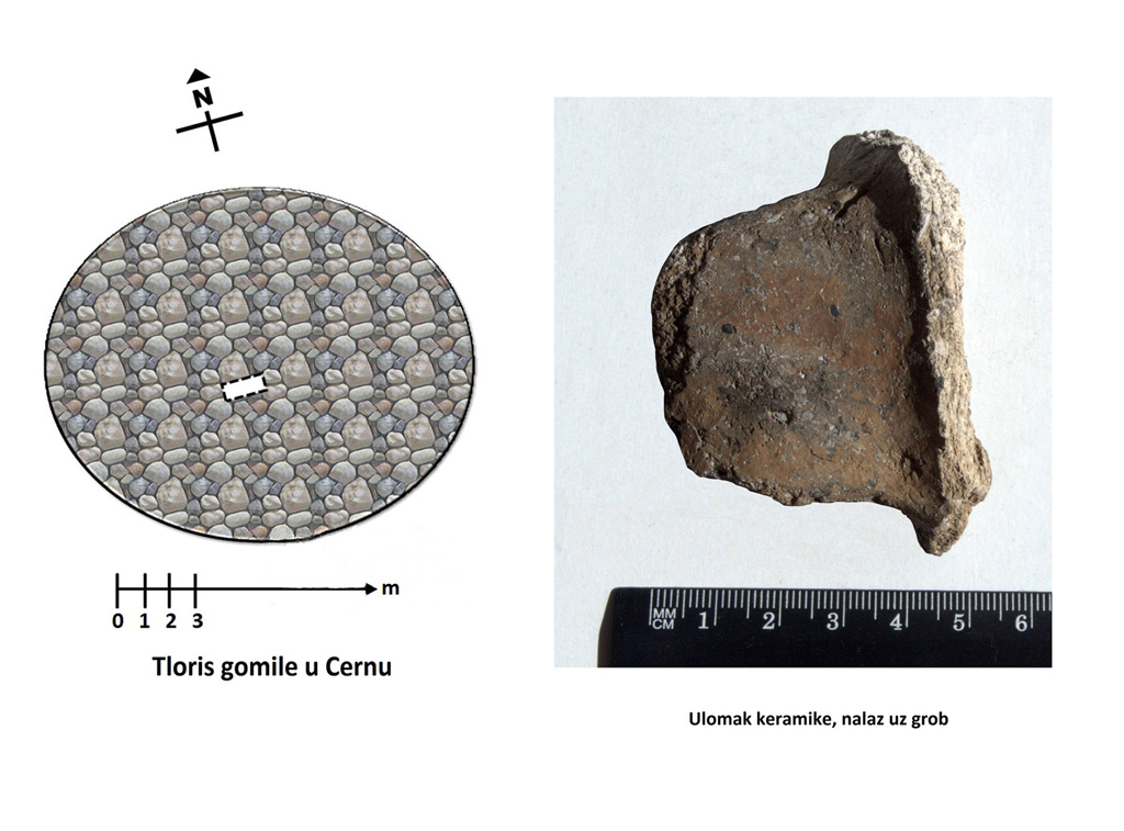Na području naselja Cerno, predio Oplanovina, k. č. 289, K.o. Cerno, vl. Toni Zelić, kota 119 m, N 43°12.500′ E 017°38.203′, zbog građevinskih radova bila je ugrožena prapovijesna kamena gomila. Na poziv izvođača radova, i uz pomoć šestorice domaćih radnika, obavljeno je nužno zaštitno istraživanje navedene gomile. Njezin promjer iznosio je 10 m, a visina 1,13 m. Bila je uobičajeno kružna oblika, uglavnom od krupnoga kamenja, s malo primjesa sitnoga kamenja i humusa. Međutim, bila je znatno ranije oštećena, kako u bazi tako i na vrhu. Vidjelo se da je grobna konstrukcija u sredini devastirana, a grobna ploča razbijena. Nakon čišćenja i odvoženja gornjega sloja kamenja, na visini 0,80 m pronađeni su ostaci kostiju – ukupno 15 komada, dosta sitnih i razdrobljenih. Jedini kompaktan primjerak imao je 13 cm duljine i tri cm promjer (femur). Od grobne konstrukcije preostale su samo dvije kamene ploče: jedna 60 x 40 x 9 cm i druga 55 x 35 x 11 cm. U razini dna grobnih ploča, 2,80 m od ruba gomile, pronađen je ulomak keramike 7 x 4 x 1 cm. Radi se o ulomku ručke u spoju s tijelom posude, širine pri spoju 6 cm, grube fakture s primjesama kalcita, čija se smeđa boja dijelom oljuštila. Možda je riječ o zdjeli s jezičastom ručkom na ramenu posude? Nakon evidencije, čišćenja i pohrane nalaza, nastavljen je rad na čišćenju ostatka gomile, u čijoj bazi nije nađeno više ništa. Radovi, koji su uz šestoricu radnika i stručno vodstvo arheologa Radoslava Dodiga, započeti u 9,00 završeni su u 17,00 popodne. Na zapadnom dijelu k. č. 289., oko 150 m udaljenosti od istražene gomile, nalazi se in situ manja gomila promjera oko osam metara i visine oko 0,5 metara. Uz nju na samoj površini pronađen je ulomak keramike 7,5 x 6 x 0,7 cm. Riječ je o dijelu posude s ostacima ručke smeđe boje, no znatno lošije fakture i pečenja nego pronađeni primjerak u gomili Oplanovina. Kako su u neposrednoj blizini oko gomile izvođeni radovi oko ravnanja terena, zacijelo je ulomak dospio na vrh slučajno. Predloženo je vlasniku da se gomila zaštiti i ogradi kao kulturno-povijesni spomenik, ili da se u slučaju radova na imanju, izvedu zaštitni arheološki radovi.