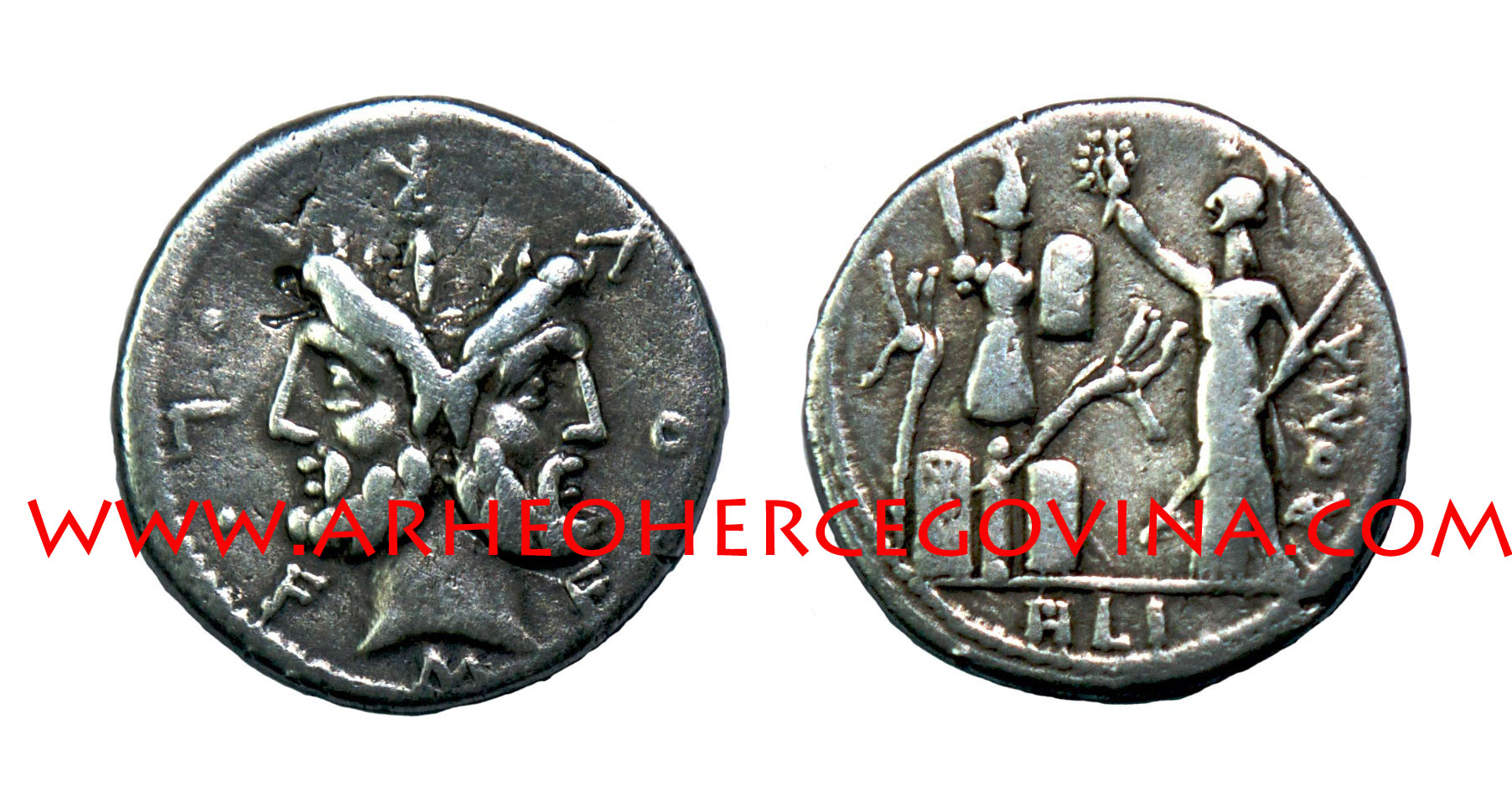 Denar M Furius Philus, kovnica Roma, 119. pr. Kr. nalazište Hardomilje Ljubuški, avers okrunjena glava Janusa, revers prikaz božice Rome sa žezlom kako kruni tropej (foto I. Dragicevic)