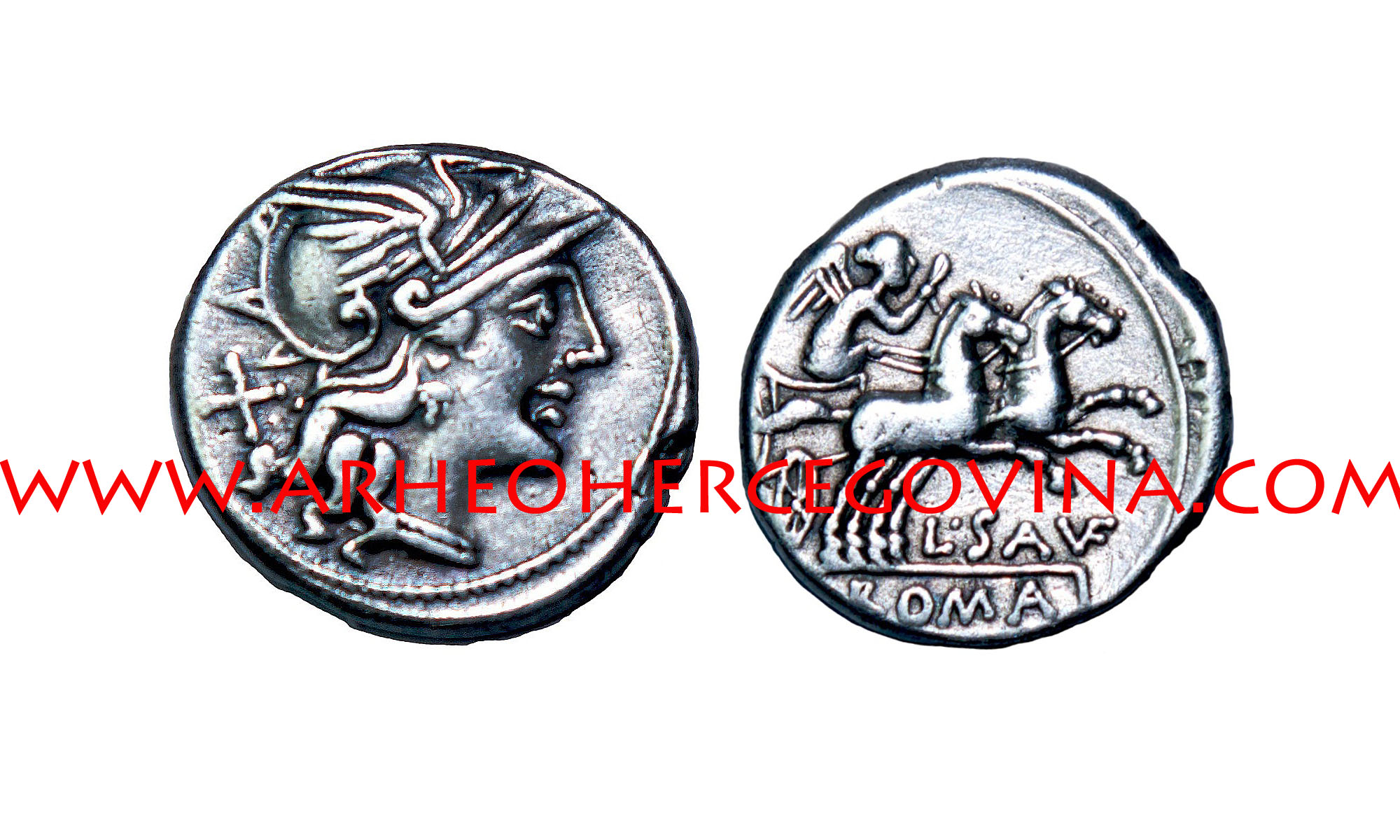 Srebreni denar, L. Saufeius, 152. pr. Kr., kovnica Roma, nalazište Duvanjsko polje, avers glava Rome sa kacigom, revers prikaz Viktorije u bigi (dvopreg)