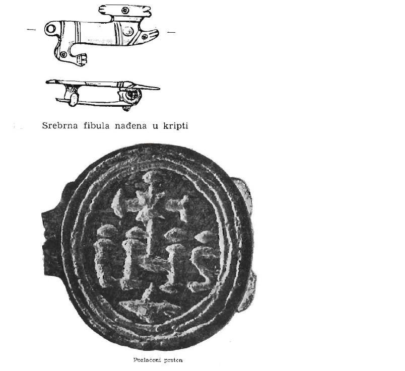 Ono što odlikuje dvojnu crkvu na Gradcu su upisane apside u četvrtasti zid. Također, još jedna odlika veće crkve je kripta ili grobnica na svod, sagrađena u prezbiteriju i naosu. U zapadnom dijelu kripte sagrađene su stepenice za ulaz u grobnicu, a u istočnom dijelu kripte nalazi se sarkofag od velikih mramornih ploča, od kojih je pet ploča profilirano, a dvije nisu. P. Oreč je bio mišljenja kako postoji mogućnost da su profilirane ploče donesene sa druge građevine, možda sa antičkog hrama koji je bio u blizini otkopane crkve. Kripta je sagrađena od tzv. miljevine i jednog komada (stupac) korčulanskoga mramora, vjerojatno donesena isto sa antičkog hrama. Prilikom pljačkanja grobnice, razbijena je zapadna ploča i razbacane su kosti radi potrage za prilozima. Ipak u istočnom dijelu kamenoga kovčega pronađena je srebrena fibula (kopča) sa željeznim trnom (Sl. 2.). Fibula iz Gradca predstavlja stiliziranu životinju u trku, s rupom na repu, krugovima na nožnim zglobovima i očima, te ugraviranim linijama kod zadnjih i prednjih nogu. Vjerojatno se radi o prikazu srne ili zeca.
