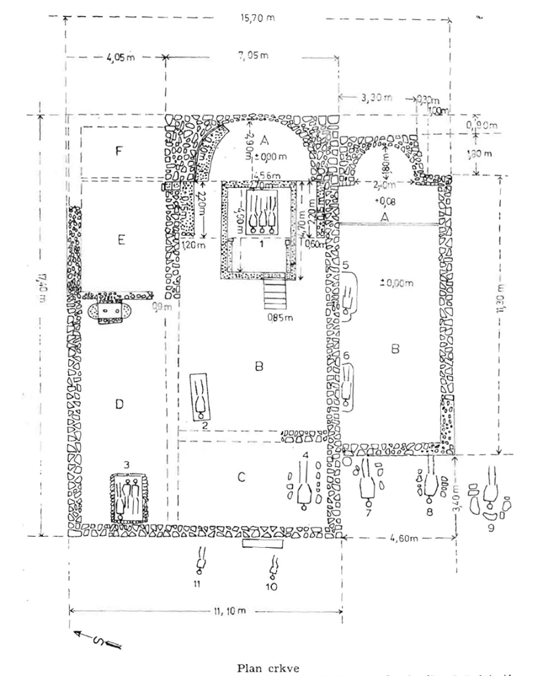 Vanjske dimenzije sjeverne crkve su: dužina 17,40 m i širina 11,20 m, a prostorije od kojih se sastoji su: prezbiterij (A), naos (B), narteks (C), krstionica (D) i prostorija (F). Manja crkva je prislonjena uz veću crkvu, a vanjske mjere manje crkve iznose: dužina 13,10 m i širina 4,60 m, a sastoji se od dvije prostorije: prezbiterija (A) i naosa (B).